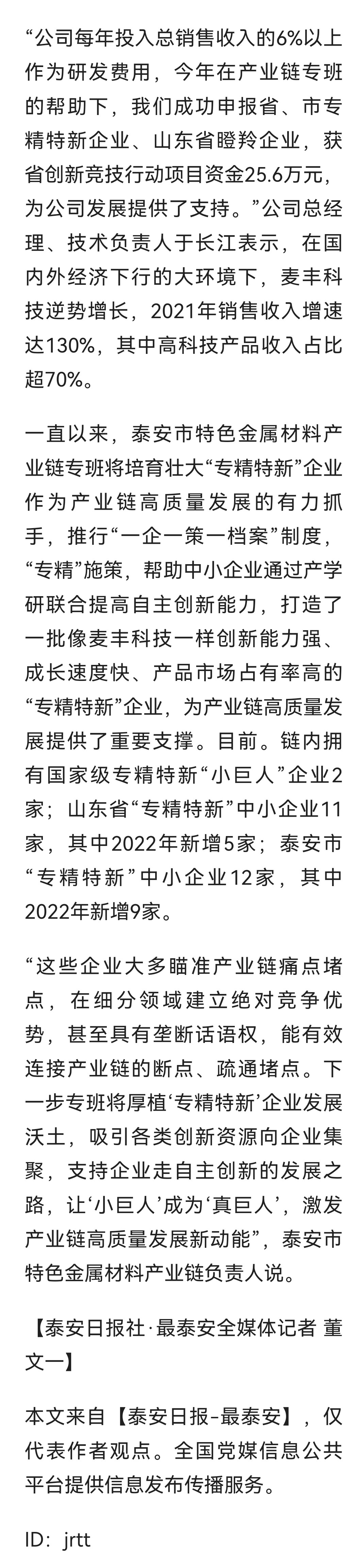 近日,大眾網(wǎng)、泰山日報(bào)、ZAKER泰安等多家媒體以麥豐為主線,刊發(fā)《泰安市特色金屬材料產(chǎn)業(yè)鏈:厚植“專精特新”企業(yè)發(fā)展沃土 培育高質(zhì)量發(fā)展新動能》文章。